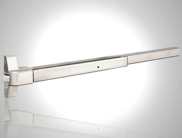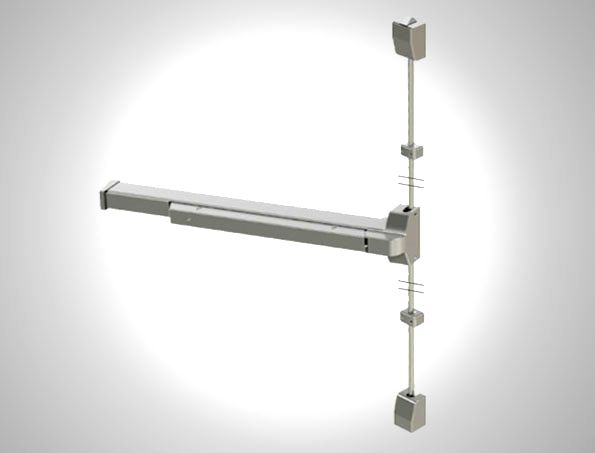 Barra de pánico vertical con dos puentos de trabamiento. Fabricada de aluminio o acero inoxidable. Medida desde 36" hasta 48".